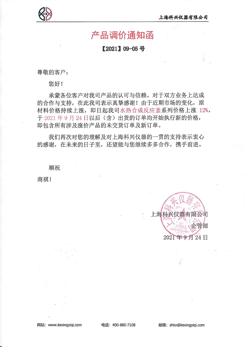 承蒙各位客戶對(duì)我司產(chǎn)品的認(rèn)可與信賴。對(duì)于雙方業(yè)務(wù)上達(dá)成的合作與支持,在此我司表示真摯感謝!由于近期市場(chǎng)的變化,原材料價(jià)格持續(xù)上漲,即日起我司水熱合成反應(yīng)釜系列價(jià)格上漲 12%,2021 年 9 月 24 日以后(含)出貨的訂單均開(kāi)始執(zhí)行新的價(jià)格,既包含所有涉及漲價(jià)產(chǎn)品的未交貨訂單及新訂單。